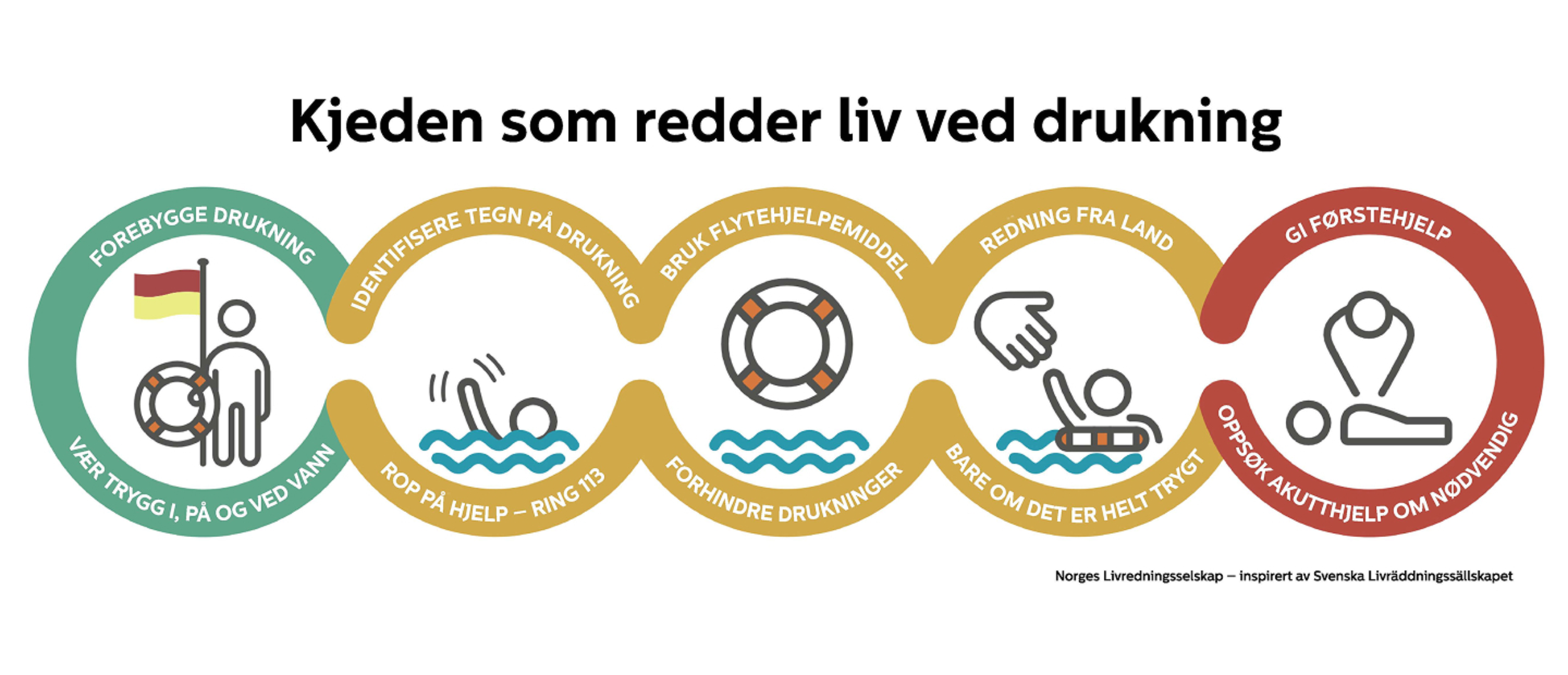 Illustrasjonen som Norges Livredningsselskap bruker, med inspirasjon fra Svensk Livräddningssällskap, viser redningskjeden som en sammenhengende prosess, der hvert ledd bygger på det forrige: