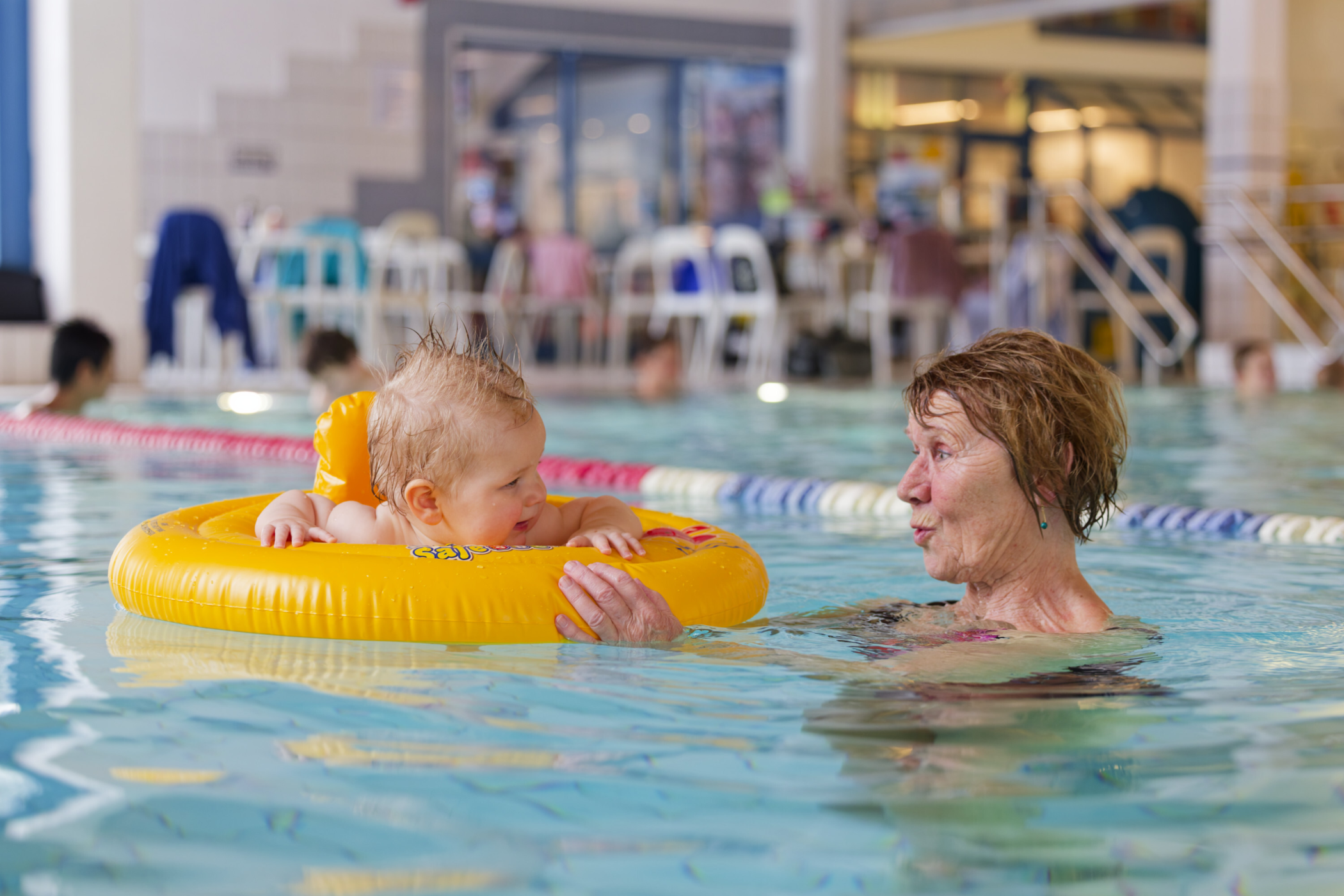 Elleve måneder gamle Ulrik følger nøye med når oldemor Unny skyver den knallgule baderingen rundt i barnebassenget. Hun lager grimaser, han følger med med store, sjarmerende øyne, mens smilet smitter begge veier.