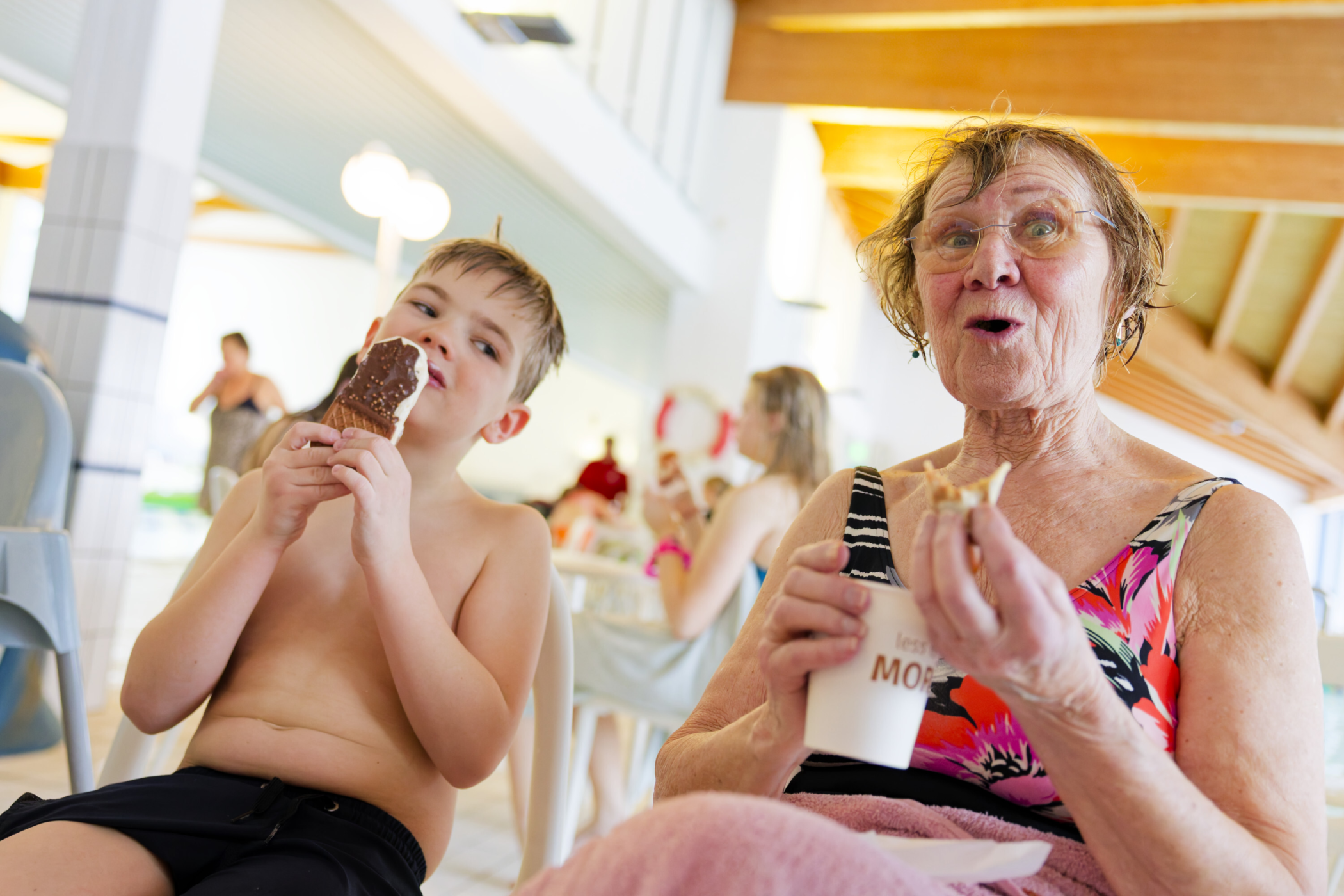 Etter bading og sklier venter en velfortjent kos med is, pølser, kaffe og lune håndklær på bassengkanten. Minstemann har sovnet og Unny ser på familien sin med et varmt blikk.