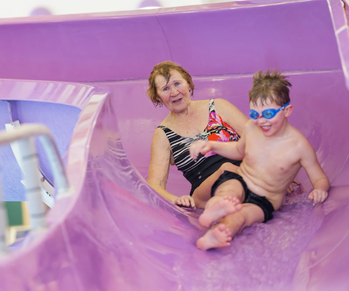 Svømmehallen har vært et fast ukentlig møtested for familien i over tjue år. Her samles fire generasjoner, og Unny er fortsatt den som oppmuntrer, passer på og lærer bort.